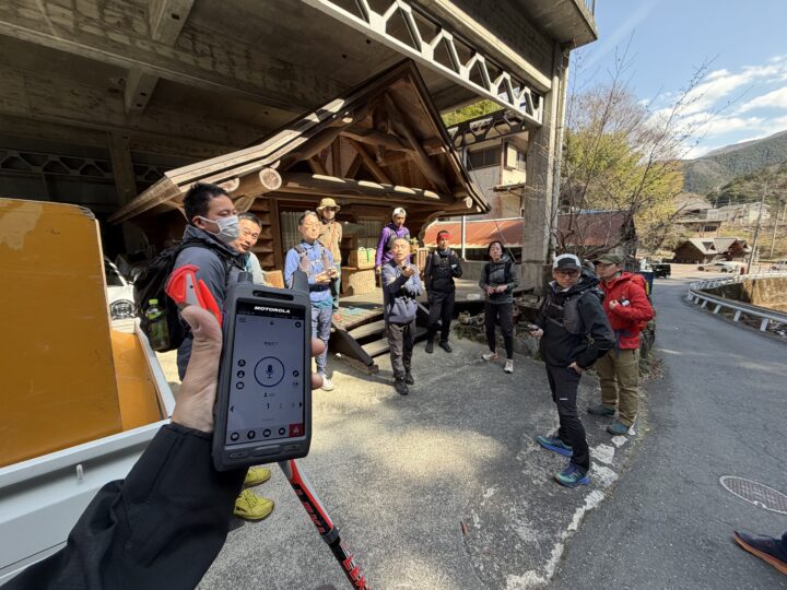 無線の説明をしていただき、参加者全員が実際に無線を持って山に入る。